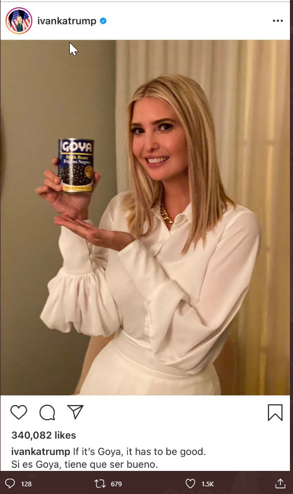 White House communications aide Carolina Hurley defended Ivanka’s tweet by stating: “Only the media and the cancel culture movement would criticize Ivanka for showing her personal support for a company that has been unfairly mocked, boycotted and ridiculed for supporting this administration — one that has consistently fought for and delivered for the Hispanic community,” adding “Ivanka is proud of this strong, Hispanic-owned business with deep roots in the U.S. and has every right to express her personal support.”