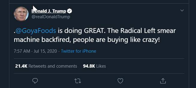 Critics of the president have been calling for a boycott of Goya after CEO Robert Unanue stated “We’re all truly blessed at the same time to have a leader like President Trump, who is a builder” at a White House event. Unanue continued, “”He came to this country to build, to grow, to prosper. And so we have an incredible builder, and we pray for our leadership, our president, and we pray for our country that we will continue to prosper and to grow.””